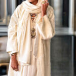 This off-white bisht features a soft linen jacket, gracefully tailored and adorned with intricate embroidery across the front, back, and sleeves. Beneath, the inner dress is crafted from striped linen, showcasing handwork and embroidery around the neckline, accented with subtle golden-lined stripes. Completing the look is a cotton-linen striped scarf, its edges beautifully embroidered to echo the ensemble’s graceful spirit.