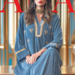 A silk velvet kaftan that whispers elegance in every fold. The neckline is framed with refined piping work, lending structure to its fluid silhouette. Delicate embroidery graces the neckline and cuffs, catching light in its wake. The upper body and center back panel are adorned with intricate handwork—each stitch a testament to craftsmanship and care.