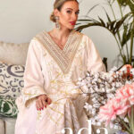 Elegant white cotton fabric with intricate hand-embroidered floral designs in golden thread.