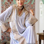 This silk velvet kaftan in a soft light blue hue exudes timeless grace. The front neckline is adorned with delicate handwork, framed by matching color piping that adds subtle refinement. Intricately embroidered panels flow along the front and back sides, extending to the cuffs. Designed to drape with grace, the silhouette moves like poetry.
