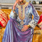 This silk velvet kaftan is a tactile indulgence, offering a luxuriously soft handfeel and a marbled texture that catches the light with quiet opulence. The neckline is adorned with intricate hand embroidery, where multicolored threads and delicate zardosi work converge in a celebration of artisanal mastery. A plum tree motif blooms across the front and back panels, embroidered with poetic precision and framed by shimmering zardosi patches that evoke timeless grandeur. The cuffs are finished with silver-threaded stripes in a geometric rhythm, adding a contemporary edge to this heritage-inspired silhouette.