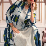 A harmonious pairing, this bisht features a striking cotton jacket adorned with a geometric mosaic print. A braided tape detail runs gracefully from neckline to hem, adding a tactile rhythm. Beneath, the linen dress flows in natural-toned stripes, its round neckline and simple cut offering a serene counterpoint to the jacket’s bold geometry.