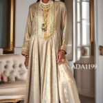 Step into radiance with this A-line kaftan crafted from a luxurious silk-viscose blend, designed to flow effortlessly with every movement. The allover golden shimmer fabric catches the light beautifully, creating a soft, luminous glow. Intricate embroidery graces the neckline and sleeve cuffs, delicately accented with pink and green piping for a touch of refined contrast. The drape falls gracefully, enhancing the silhouette with understated elegance—perfect for moments that call for quiet grandeur.