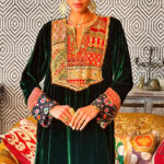 This luxurious silk-velvet kaftan comes in a rich emerald green, highlighted by an intricately embroidered multi-colour neckline that showcases exquisite craftsmanship. The front yoke is framed with delicate fringe lace, adding a refined, textural detail. The cuffs feature contrasting black printed fabric adorned with fine embroidery and finished with a shimmering golden tape, creating a perfect blend of tradition and elegant modernity.