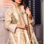 Elevate your elegance with this exquisite bisht where the inner dress, crafted from lustrous silk, draping gracefully around you. The jacket, tailored from cotton chanderi, offers a subtle contrast with its soft texture and airy charm. The true pièce de résistance, however, lies in the shimmering embroidery adorning the right side of the jacket—a constellation of intricate patterns that sparkle with every movement, drawing all eyes and admiration.
