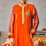 A symphony of silk and finesse, this orange velvet kaftan exudes regal charm through its intricate embroidery gracing the neckline and sleeve cuffs. A delicately hand-worked patch adorns the chest, adding a touch of artisanal heritage, while the sleeves—crafted from light brocade—introduce a subtle matching texture and luminosity. Designed to captivate, this piece blends tradition with quiet opulence.