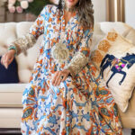 An ode to celestial splendor woven in cotton. Cascading in a flow of ethereal hues, its fabric cradles the body like a whisper of dawn’s first light while embroidery, kissed by molten gold, adorns the sleeves in an intricate dance. The chest, an altar of magnificence, boasts a breathtaking patchwork masterpiece, each stitch a verse in an unwritten legend. Vivid floral bursts bloom upon the fabric like constellations upon the midnight sky.