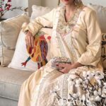 Crafted from luxurious cream fabric, it features intricate embroidery and delicate embellishments on the yoke and then running down towards the hem that create a visual masterpiece. The detailed neckline boasts gold and pink accents, gracefully complemented by lace and patterned fabric running along the front.