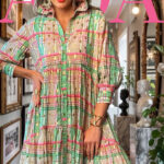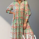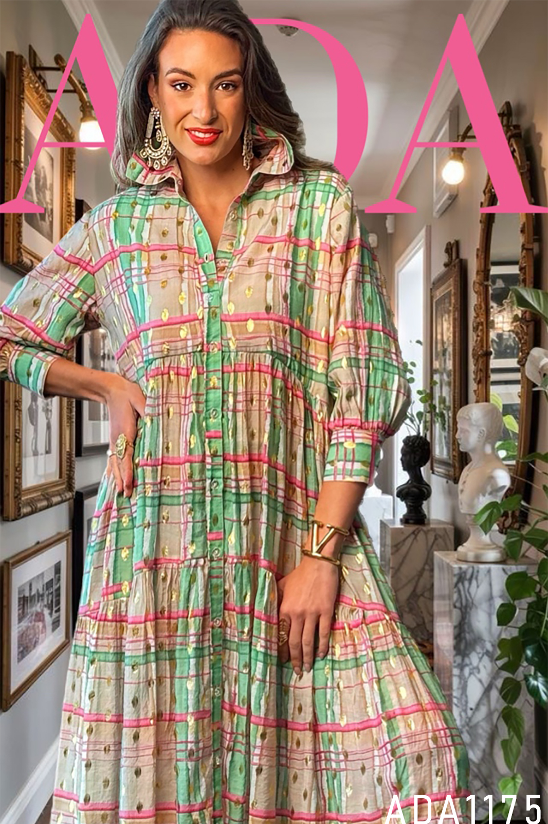 Crafted in lustrous silk,this kaftan is adorned with a multicolored check print that dances across every panel. The front opens with a full button-down closure, lending versatility and ease, while subtle gathers at both skirt panels introduce movement and volume. Sleeves taper into functional button cuffs, adding a touch of refinement to the relaxed drape.