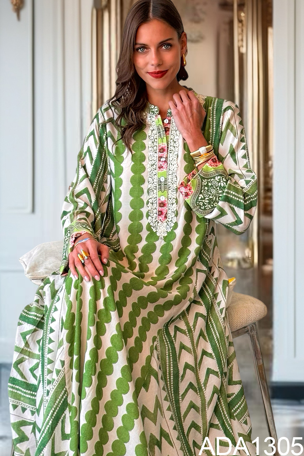 This viscose kaftan with its soft hand feel is like a whisper against the skin. Its adorned with meticulous hand embroidery with off-white threading around the neckline. The bold zigzag and circular motifs ripple across the fabric like echoes of tradition reimagined.