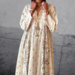 Conjured for a sovereign spirit who walks not merely with grace but with quiet command. Flanking this off-white based silken expanse are side panels of fine cotton, chosen not for contrast alone but for their poetic interplay of golden texture design. These panels are adorned with silver tape prints. At the heart is an embroidered neckline that evokes the grandeur of ancient diadems.