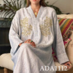 A majestic kaftan that embodies timeless grace, crafted from luxuriously soft textured fabric that drapes with effortless charm. The neckline is accentuated with delicate dori piping, adding a subtle yet distinguished detail. Intricate handwork graces the chest, where shimmering zari threads intertwine with delicate beads and sequins, forming a luminous floral motif.