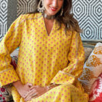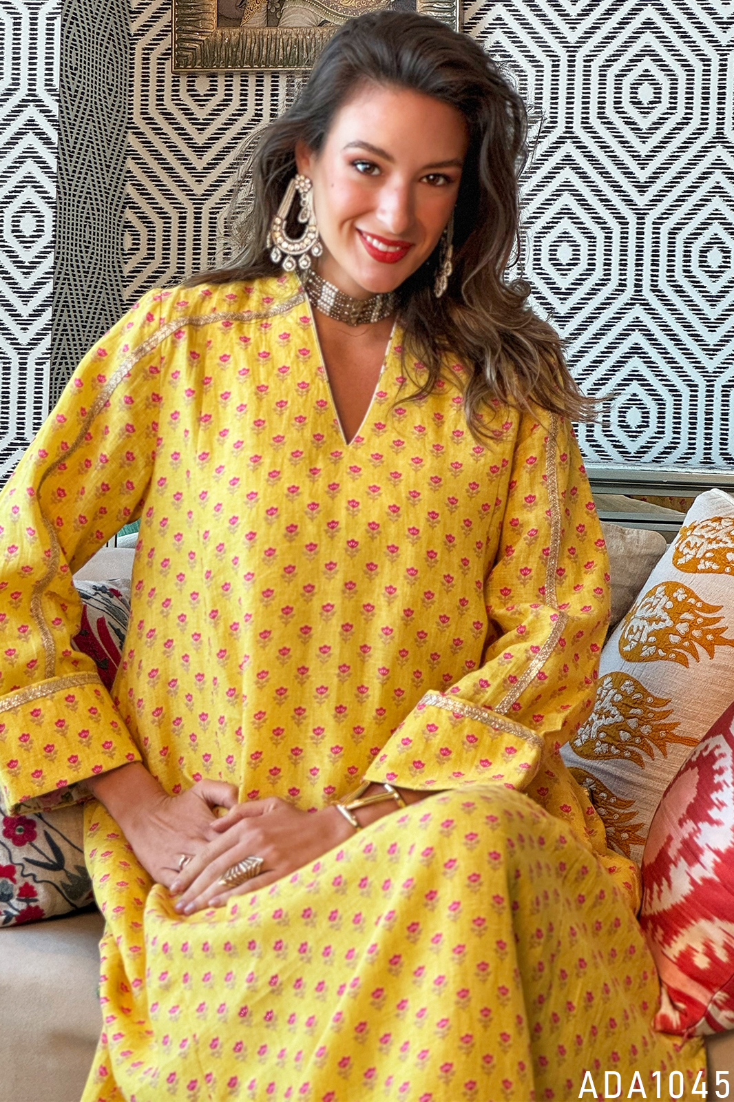 Treat yourself with a kaftan with the finest linen flowing effortlessly with lurex lace kissing it from the shoulder to the cuffs creating a rich tapestry of intertwining blossoms and leaves, each petal and vine meticulously crafted to create depth and movement.