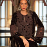 A regal silk velvet kaftan whose neckline and cuffs are adorned with delicate embroidery, meticulously handworked. Sequins shimmer subtly across the embroidered motifs, catching light with quiet brilliance. Below the cuffs, intricate cutwork on the sleeves adds a sculptural dimension, an interplay of shadow and texture that elevates the silhouette.
