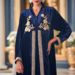 A silk velvet kaftan whose neckline is adorned with delicate pintucks, adding gentle texture and refinement. Embroidery graces both sides of the chest and backside, framing the upper silhouette with symmetrical elegance. From the neckline to the hem, a cascade of embroidery embellished with rhinestones creates a luminous vertical accent. The cuffs are richly embroidered, echoing the ornate theme ensuring beauty from ever angle.