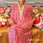 The body of the garment is crafted from a sumptuous printed fabric, brought to life by intricate criss-cross embroidery that dances across its surface like woven constellations—each stitch a tribute to heritage and precision.