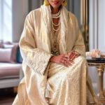 This kaftan is somethin that reigns not merely as attire, but as a coronation of craftsmanship. Woven from linen infused with lurex threads, the jacket glimmers like stardust. Its subtle shimmer evokes the aura of a celestial mantle, draped upon a queen. The dress front and sleeves are a cascade of silk drenched in sequins and hand embroidery, with sleeves that ripple with light, echoing the grandeur of palace corridors. The neckline is framed with delicate piping and intricate handwork with a separate silk scarf, embroidered with motifs.